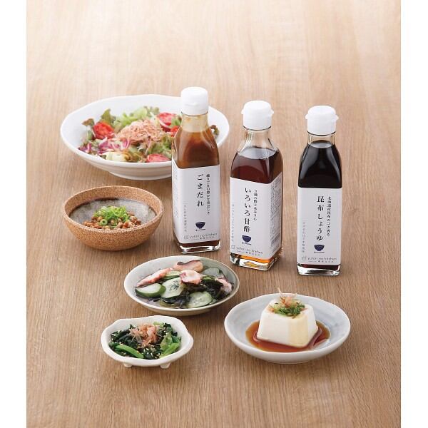 商品内容:●昆布しょうゆ235g、いろいろ甘酢220g、ごまだれ245g