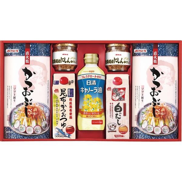 商品内容:●直火焼ソフトパック(2.5g×7)×2、日清キャノーラ油350g・昆布かつおつゆ500ml・鰹節屋の白だし500ml×各1、北海道産にしんほぐし50g×2