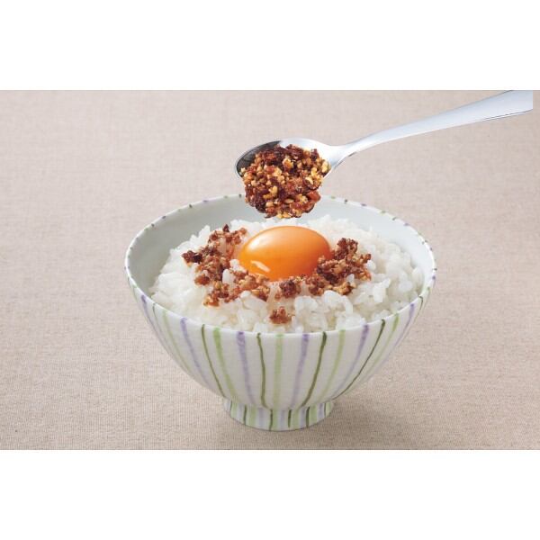 サクサク新食感のフリーズドライしょうゆ入り食べる調味料です。フリーズドライで旨みの詰まったサクサクしょうゆフレークに、フライドガーリックやフライドオニオンなど、香ばしい具材と合わせ、オイルに漬け込みました。しょうゆとガーリックの旨みと香ばしさがあり、サクサクした食感で卵かけごはんや海鮮ユッケ丼などごはんとの相性が抜群なだけでなく、ナムルやサラダ、ゆで野菜、豆腐、餃子、パスタ、炒め物などにのせて・あえて・炒めてと様々な料理にお使いいただけます。