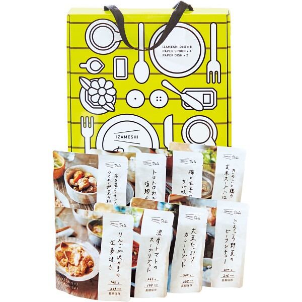 味にこだわった保存食・イザメシDeliと紙皿、スプーンが同梱されたセットです。箱は簡易テーブルとしてご使用いただけます!自宅や会社での備蓄用としてはもちろん、お世話になっている方へのギフトとしてもオススメです!