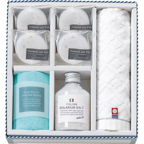 商品内容:●ウォッシュタオル・マイクロファイバークロス各1枚、ソルト・フィズ40g4個、ソルト入浴料(イタリアン)180g1個