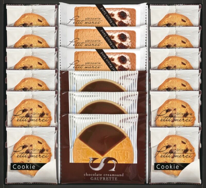 商品内容:キャラメルレーズンサンド×3、ゴーフレット(チョコ)×3、ナッツとチョコのざっくりクッキー×12