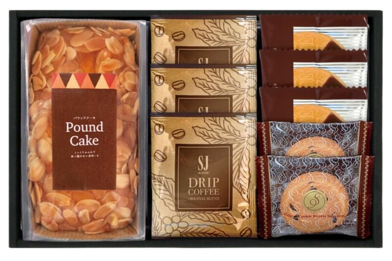 商品内容:アーモンドパウンドケーキ、ドリップコーヒー7g×3、ゴーフレット(チョコ)×3、チョコチップクッキー×2