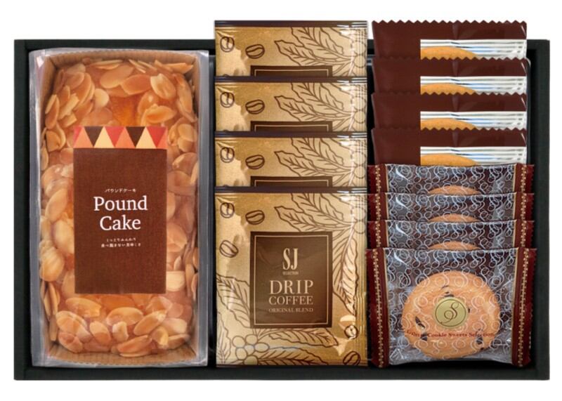 商品内容:アーモンドパウンドケーキ、ドリップコーヒー7g×4、ゴーフレット(チョコ)×4、チョコチップクッキー×4