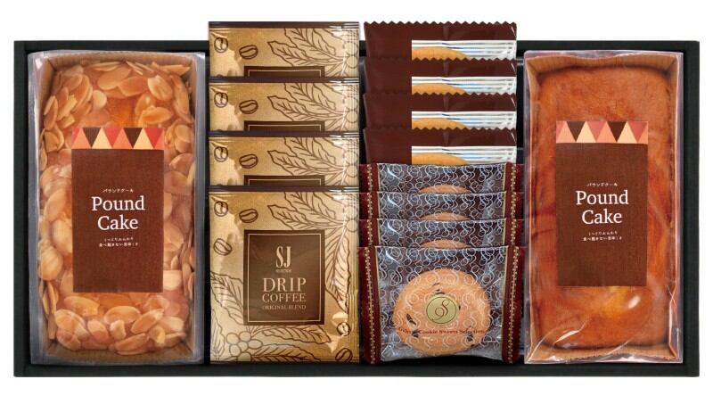 商品内容:アーモンドパウンドケーキ、プレーンパウンドケーキ、ドリップコーヒー7g×4、ゴーフレット(チョコ)×4、チョコチップクッキー×4