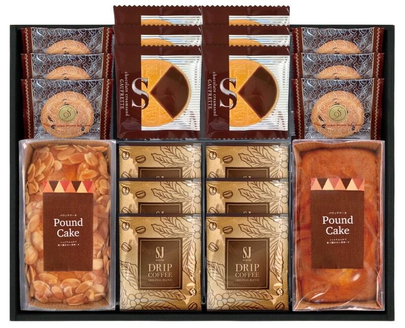 商品内容:アーモンドパウンドケーキ、プレーンパウンドケーキ、ドリップコーヒー7g×6、ゴーフレット(チョコ)×6、チョコチップクッキー×6