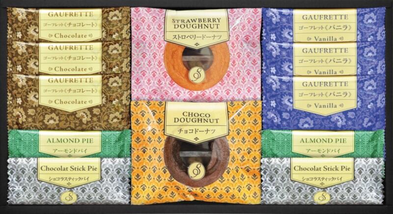 商品内容:ゴーフレットチョコ×3、ゴーフレットバニラ×3、アーモンドパイ×2、ショコラスティックパイ×2、焼ドーナツ(チョコ)×1、焼ドーナツ(ストロベリー)×1