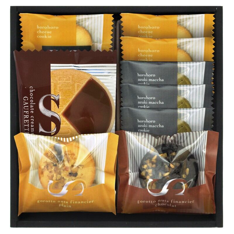 商品内容:ごろっとナッツフィナンシェ(バニラ、ショコラ)、ゴーフレット(チョコ)、ほろほろクッキー(チーズ、抹茶)×各3