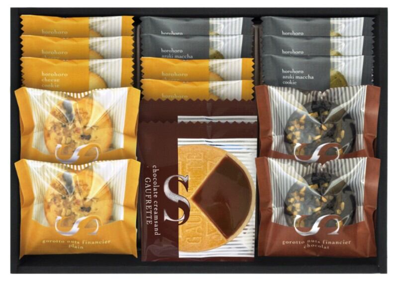 商品内容:ごろっとナッツフィナンシェ(バニラ、ショコラ)×各2、ゴーフレット(チョコ)×2、ほろほろクッキー(チーズ、抹茶)×各5