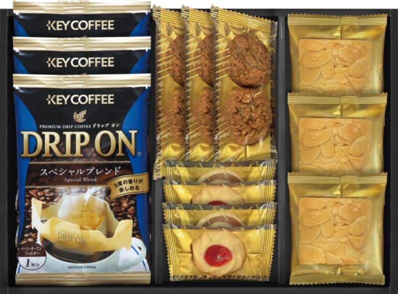 商品内容:キーコーヒードリップ8g×3、クッキー(プチラズリン×2、うずまき×2、プチコーヒー2枚入×3、トフィーアーモンド×3)