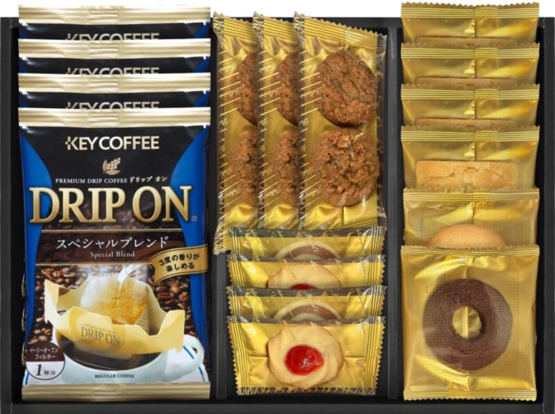 商品内容:キーコーヒードリップ8g×4、クッキー(プチラズリン×2、うずまき×2、トフィーアーモンド×4、プチコーヒー2枚入×3、リングバター、リングココア)
