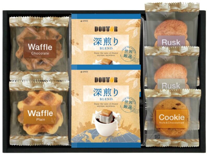 商品内容:ドトールドリップコーヒー7g×2、ラスク(シュガー・ココナッツ)、ワッフル(プレーン・チョコ)、ナッツとチョコのざっくりクッキー