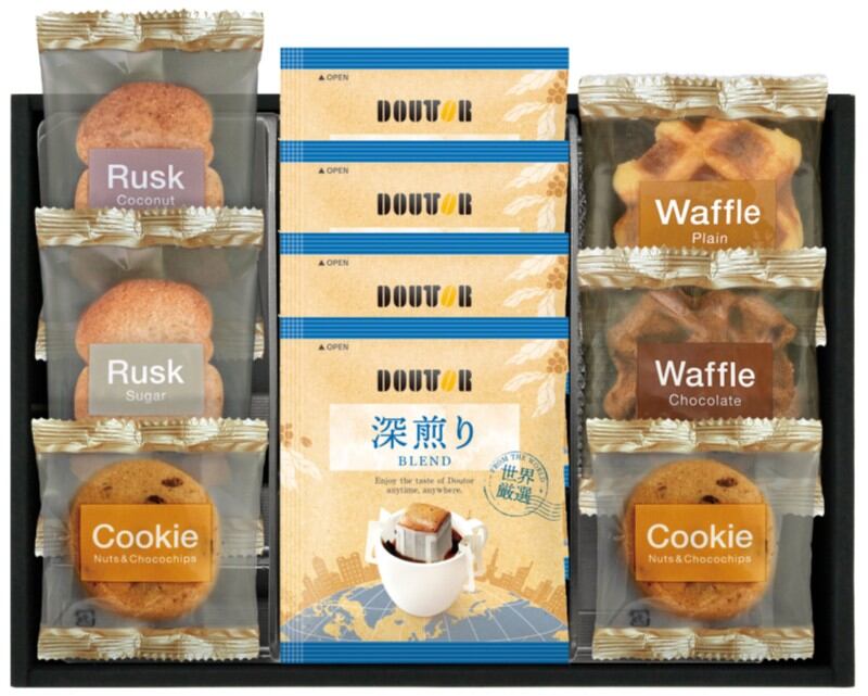 商品内容:ドトールドリップコーヒー7g×4、ラスク(シュガー・ココナッツ)、ワッフル(プレーン・チョコ)、ナッツとチョコのざっくりクッキー×2