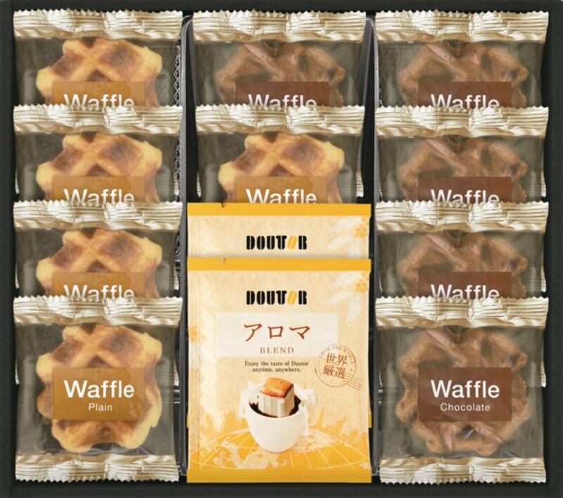 商品内容:ドリップコーヒー7g×2、ベルギーワッフル(プレーン・チョコ)×各5