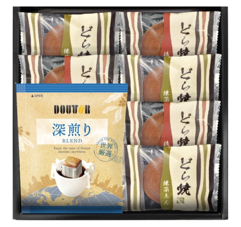商品内容:ドトールドリップコーヒー7g、どら焼き(粒あん、八女抹茶あん)×各3