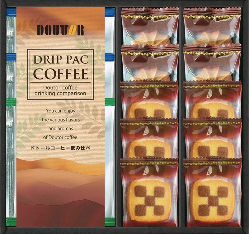 商品内容:ドトールドリップコーヒー(深煎りブレンド×2、キリマンジャロブレンド×1)、チェスクッキー×6、コーヒークッキー×4