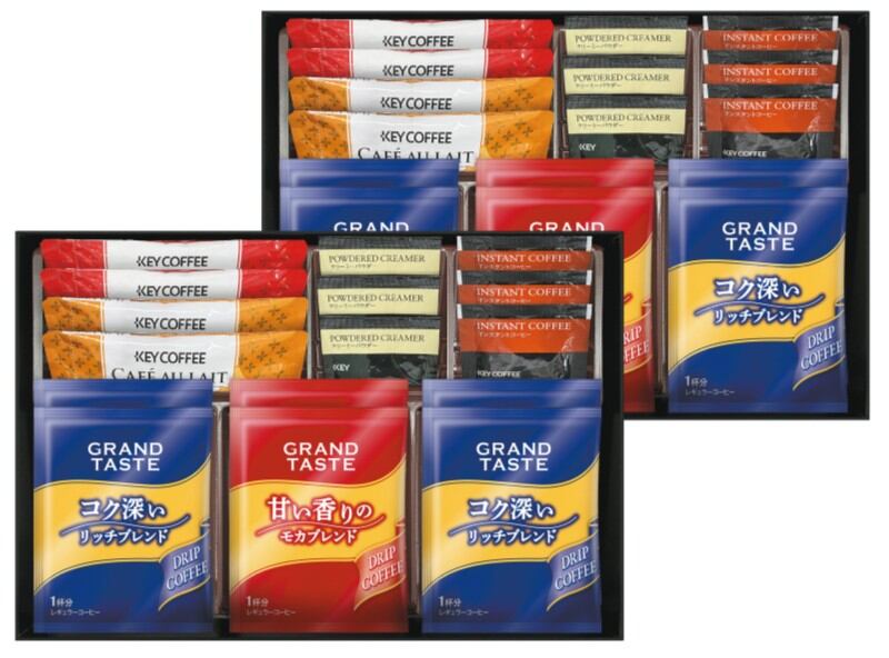 商品内容:キーコーヒードリップ(リッチブレンド1杯分×8、モカブレンド1杯分×4)、キーコーヒースティック(カフェオレ7g×4、カフェモカ7.8g×4)、キーコーヒーインスタントコーヒー2g×6、キーコーヒークリーミーパウダー2.5g×6
