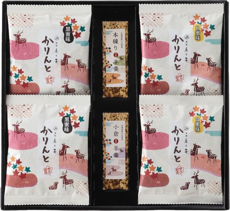 商品内容:黒蜜かりんとう 10g×2、白蜜かりんとう 10g×2、羊羹(小倉)50g×1、羊羹(本練)50g×1