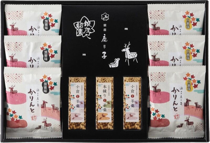 商品内容:黒蜜かりんとう 10g×3、白蜜かりんとう 10g×3、羊羹(小倉)50g×2、羊羹(本練)50g×1
