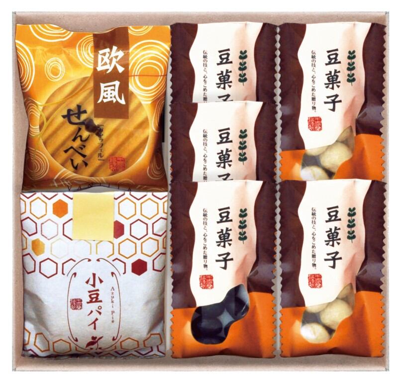 商品内容:小豆パイ、欧風せんべい、豆菓子(竹炭×3・きなこ×2)