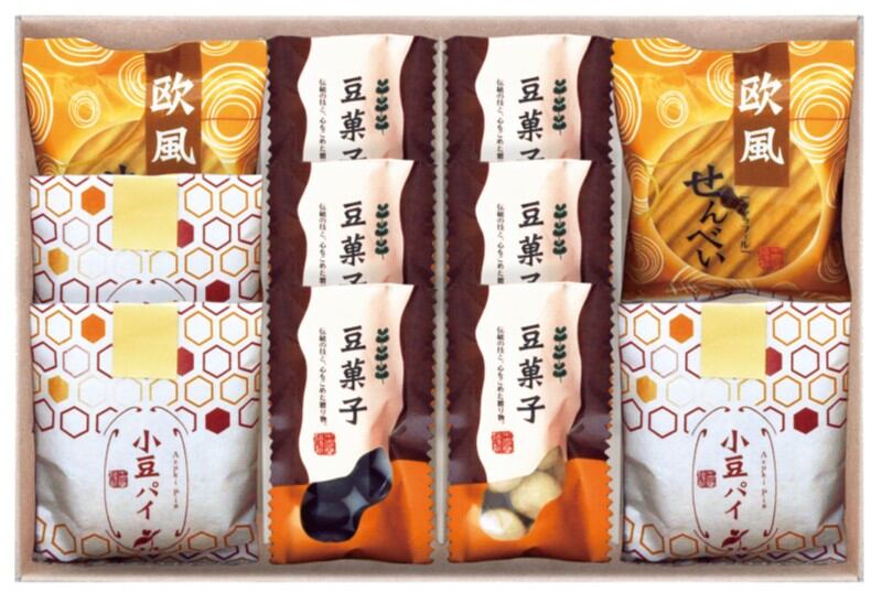 商品内容:小豆パイ×3、欧風せんべい×2、豆菓子(竹炭×3・きなこ×3)