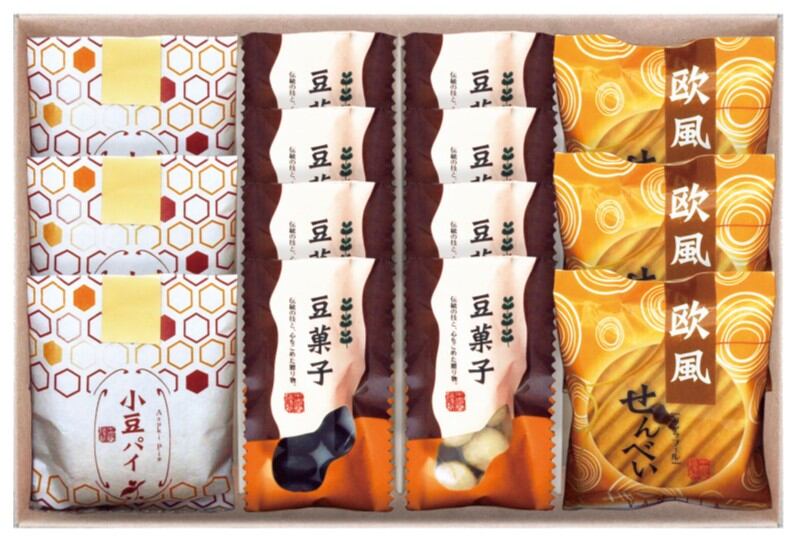 商品内容:小豆パイ×3、欧風せんべい×3、豆菓子(竹炭×4・きなこ×4)