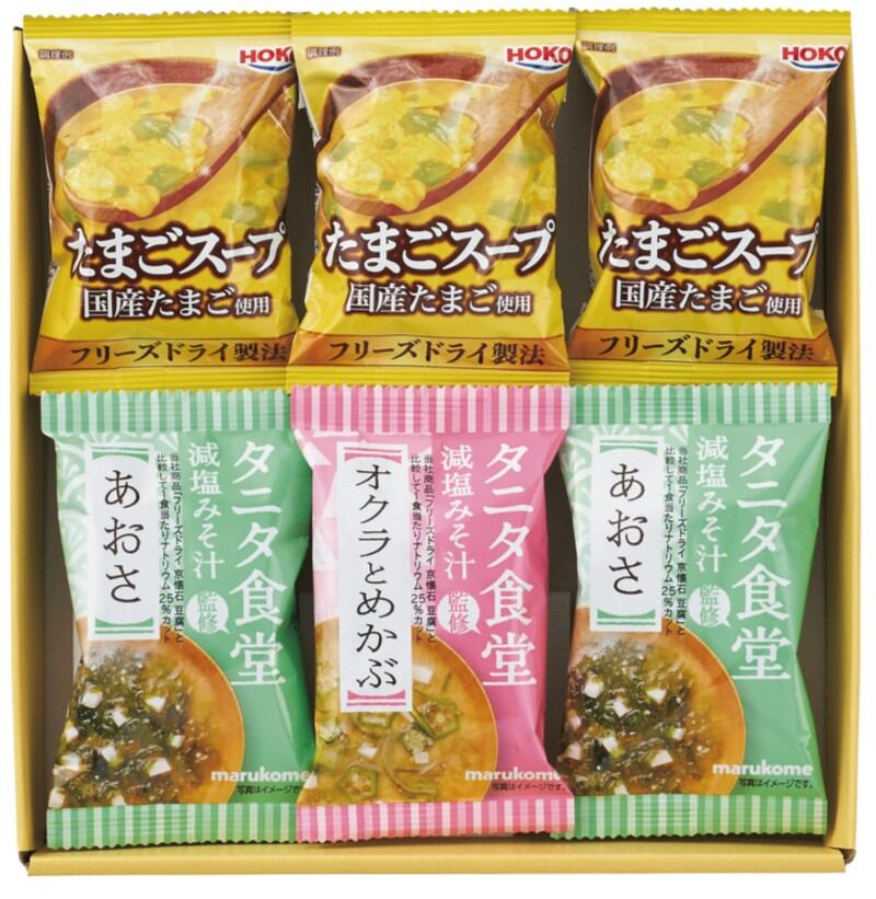 商品内容:タニタ食堂監修減塩みそ汁(あおさ×2、オクラとめかぶ×1)、宝幸たまごスープ×3