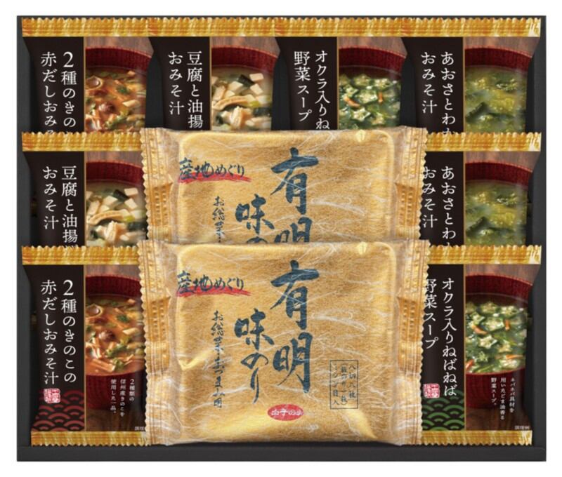 商品内容:有明味のリ(8切8枚)×2、2種のきのこの赤だしおみそ汁・とうふと油揚げのおみそ汁・あおさとわかめのおみそ汁・オクラ入ねばねば野菜スープ×各2
