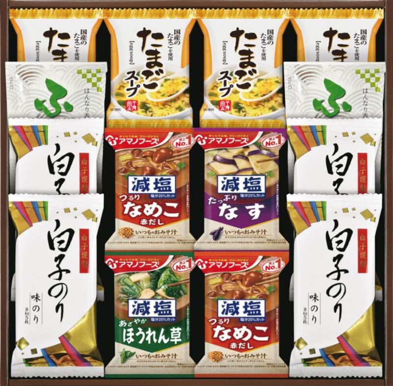 商品内容:白子のり味のり(8切5枚)×4、ふぐ入お吸い物3.2g×2、アマノフーズ減塩いつものおみそ汁なす9.0g、アマノフーズ減塩いつものおみそ汁なめこ8.0g×2、アマノフーズ減塩いつものおみそ汁ほうれん草6.8g、たまごスープ6.4g×4