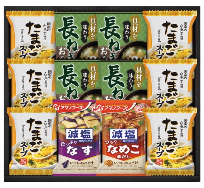 商品内容:たまごスープ6.4g×6、具材を味わうおみそ汁長ねぎ×4、アマノフーズ減塩いつものおみそ汁なす9.0g、アマノフーズ減塩いつものおみそ汁なめこ8.0g