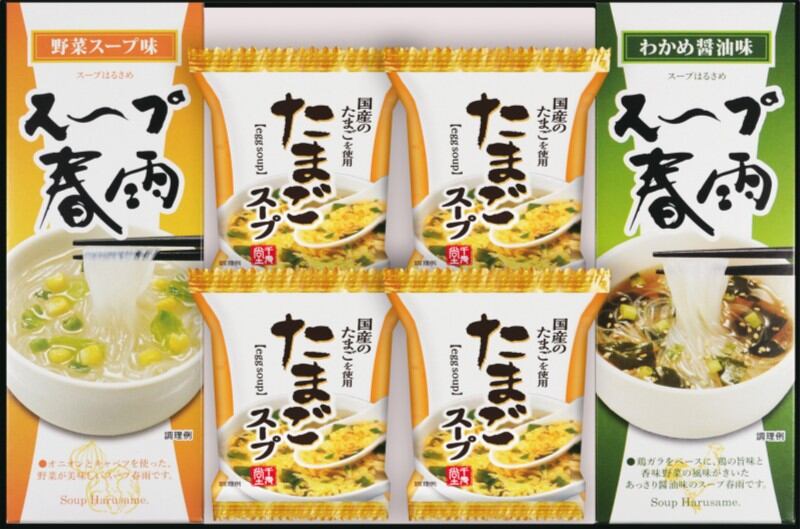 商品内容:たまごスープ6.4g×4、スープ春雨(わかめ醤油味(14.1g×2)、野菜スープ味(13.2g×2))