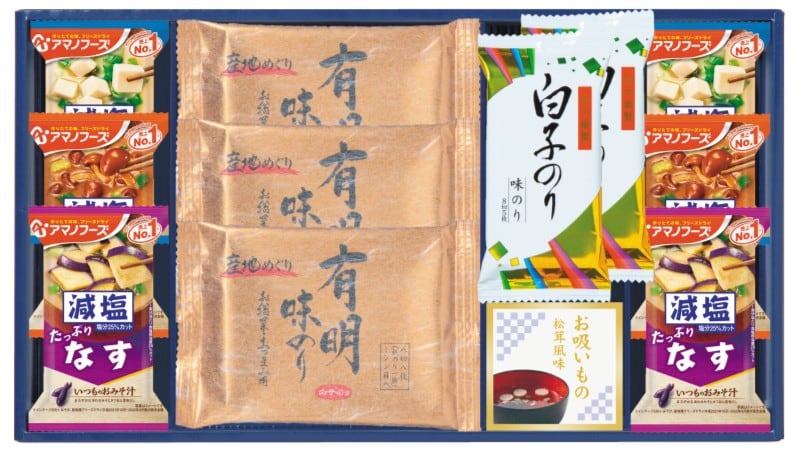 商品内容:白子のり×5(有明味のり8切8枚×3、味のり8切5枚×2)、減塩いつものおみそ汁×6(とうふ10.3g、なす9g、なめこ8g 各2)、永谷園お吸いもの松茸風味(2.3g×2)×1
