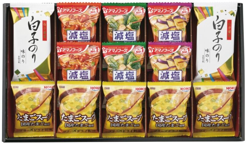 商品内容:アマノフーズ減塩いつものおみそ汁(なす・なめこ・ほうれん草)×各2、宝幸 たまごスープ×5、白子のり 味のリ(8切5枚)×2