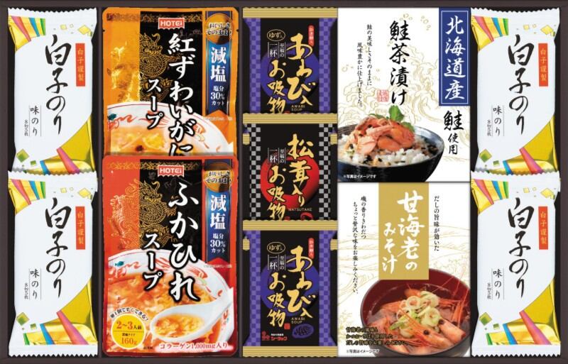 商品内容:ふかひれスープ 160g×1、紅ずわいがにスープ 160g×1、あわび入お吸い物 4g×2袋、松茸入りお吸い物 4.2g×1袋、甘海老みそ汁 (7.5g×3袋)×1、北海道産鮭茶漬け (4g×3袋)×1、白子のり (8切5枚)×4