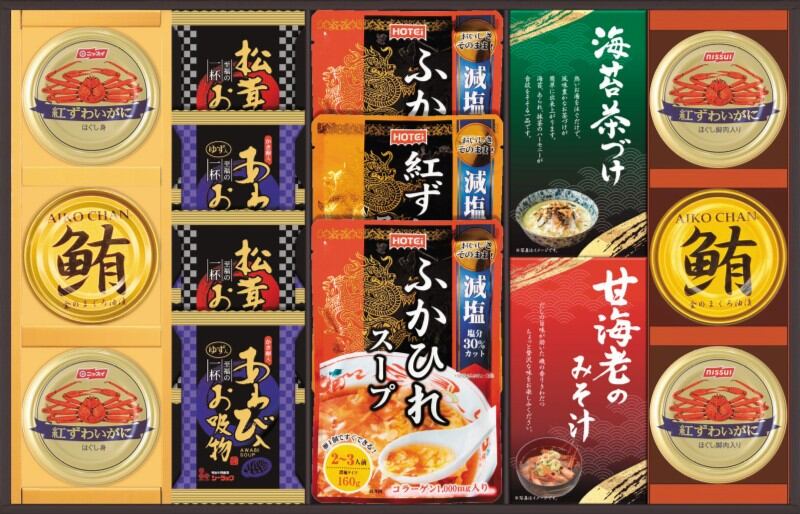 商品内容:ふかひれスープ 160g×2、紅ずわいがにスープ 160g×1、紅ずわいがにほぐし身 55g×4、鮪油漬フレーク 70g×2、あわび入お吸い物 4g×2袋、松茸入りお吸い物 4.2g×2袋、甘海老みそ汁 (7.5g×2袋)×1、丸美屋のり茶漬け (6g×4袋)×1