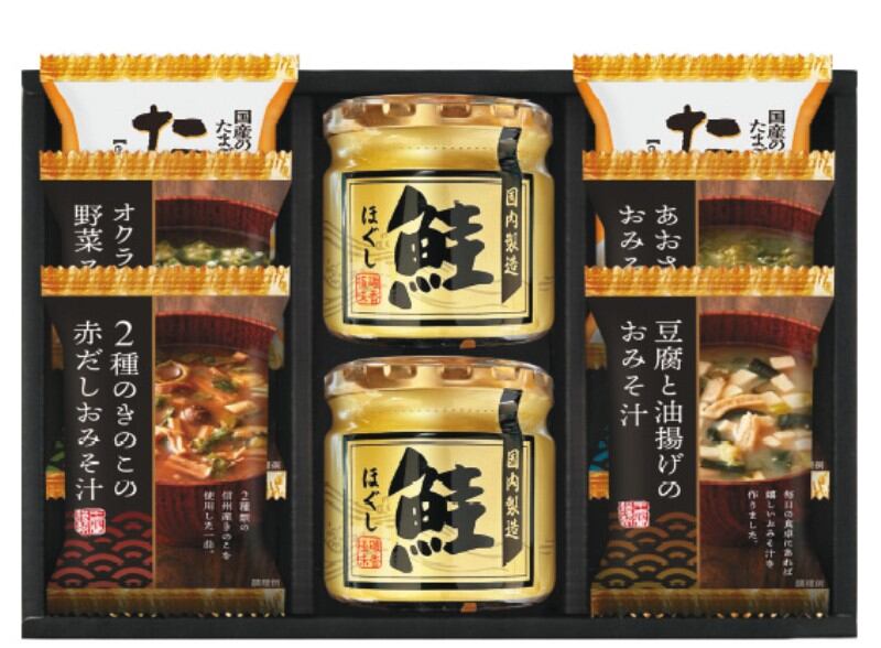 商品内容:たまごスープ6.4g×2、とうふと油揚げのおみそ汁、2種のきのこの赤だしおみそ汁、あおさとわかめのおみそ汁、オクラ入ねばねば野菜スープ、鮭ほぐし50g×2