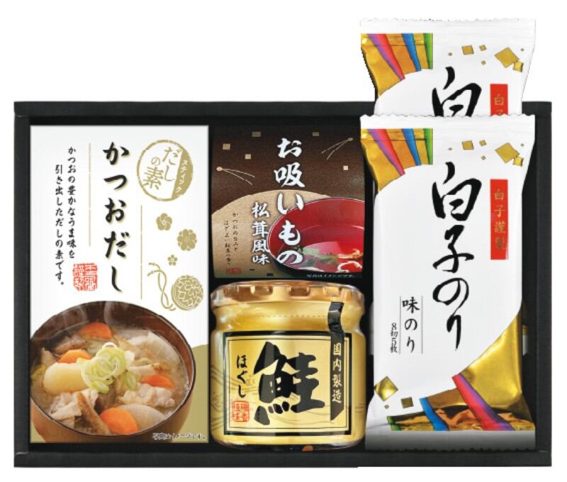 商品内容:かね七かつおだし(4g×5)、鮭ほぐし50g、永谷園お吸いもの(2.3g×2)、白子のり味のり(8切5枚)×2