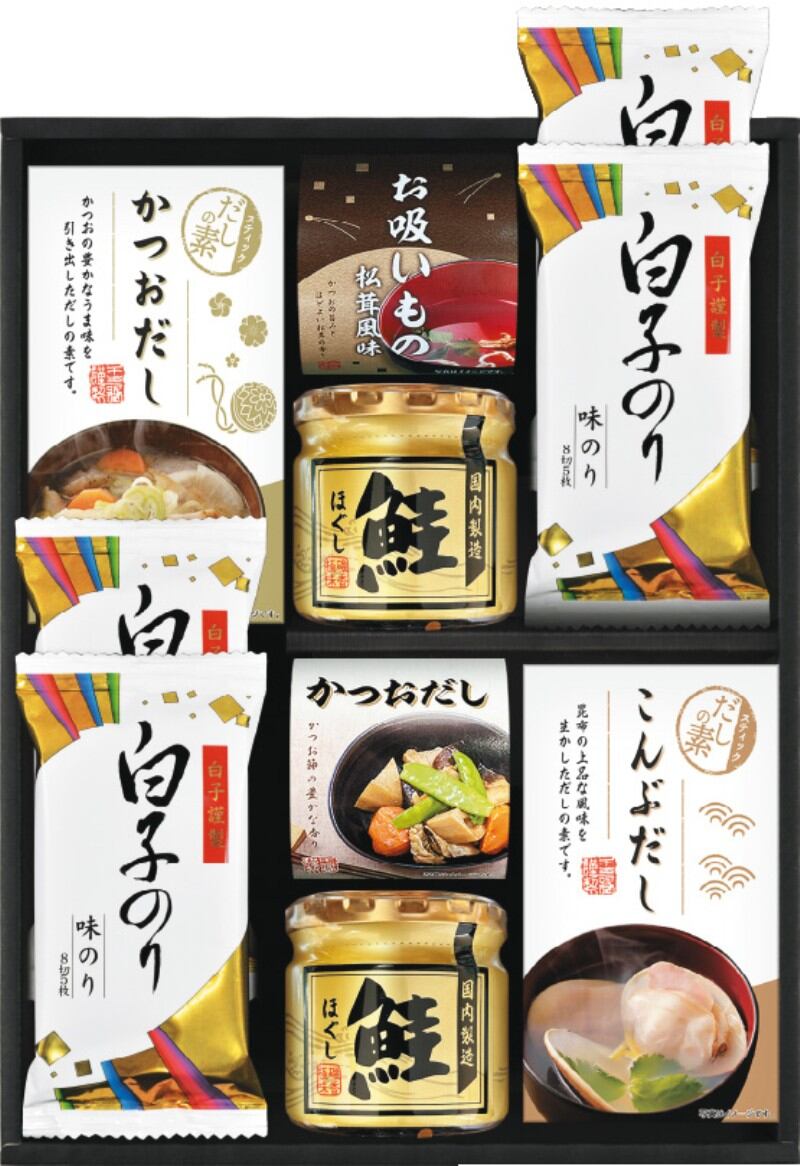 商品内容:かね七かつおだし(4g×5)、かね七こんぶだし(4g×5)、鮭ほぐし50g×2、永谷園お吸いもの(2.3g×2)、シーラックかつおだし(4g×3)、白子のり味のり(8切5枚)×4