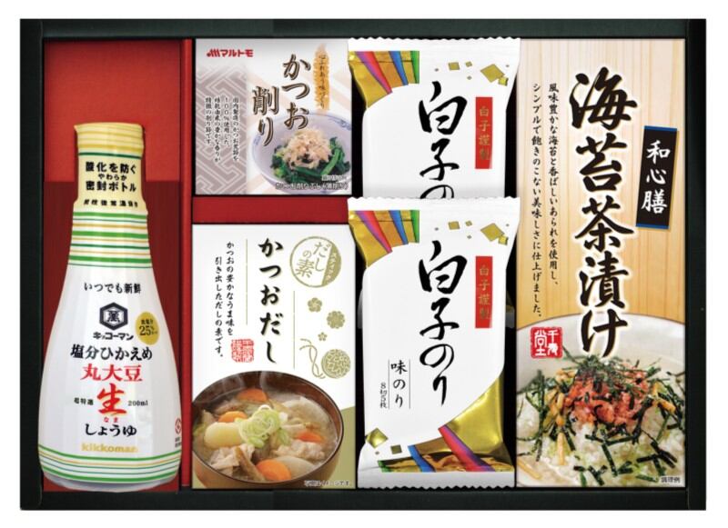 商品内容:キッコーマン塩分ひかえめ丸大豆生しょうゆ200ml、マルトモかつおパック(0.7g×3)、かね七かつおだし(4g×5)、海苔茶漬け(6.0g×5)、白子のり味のり(8切5枚)×2
