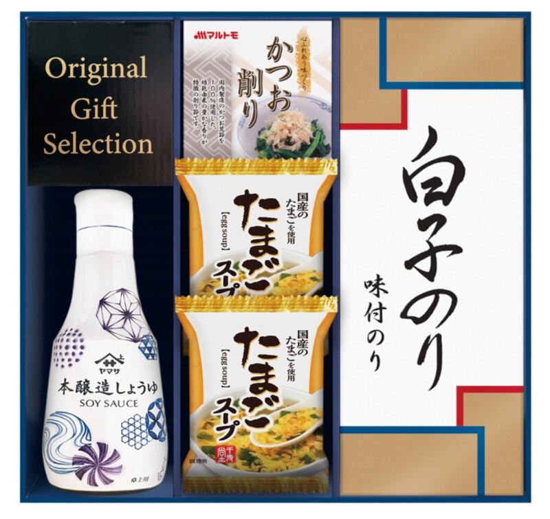 商品内容:ヤマサ鮮度しょうゆ200ml、白子のり味のり(3切5枚)、マルトモかつおパック(0.7g×3) 、たまごスープ6.4g×2
