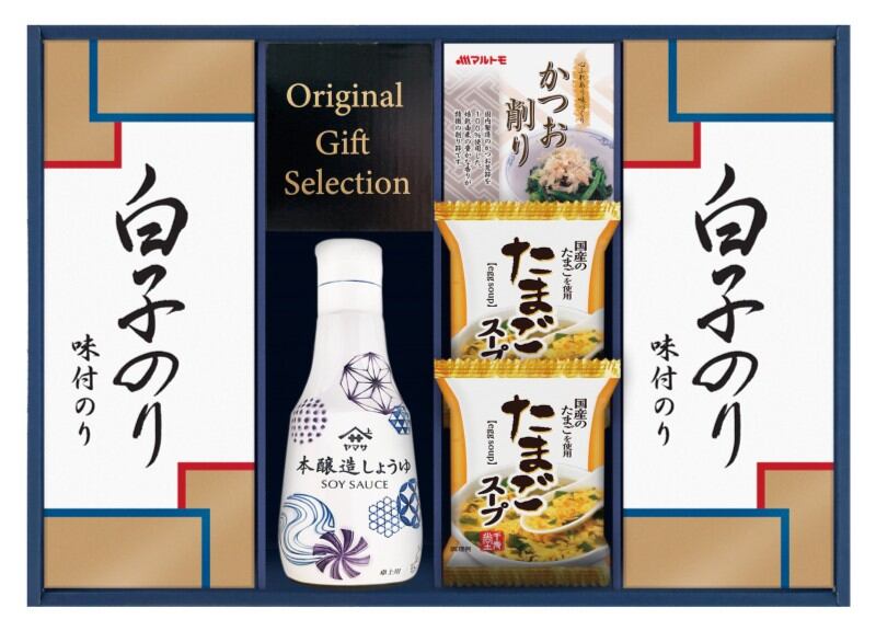 商品内容:ヤマサ鮮度しょうゆ200ml、白子のり味のり(3切5枚)×2、マルトモかつおパック(0.7g×3) 、たまごスープ6.4g×2