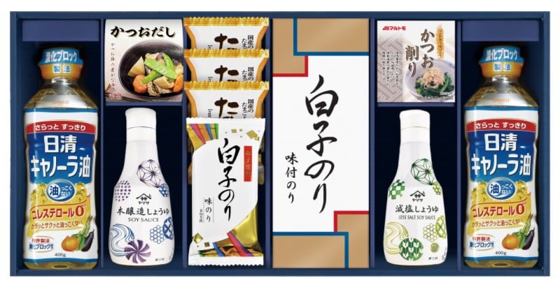 商品内容:日清キャノーラ油ペット400g×2 、ヤマサ鮮度しょうゆ200ml、ヤマサ鮮度減塩しょうゆ200ml、白子のり味のり(3切5枚)、マルトモかつおパック(0.7g×3) 、たまごスープ6.4g×3、白子のり味のり(8切5枚)、シーラックかつおだし(4g×3)