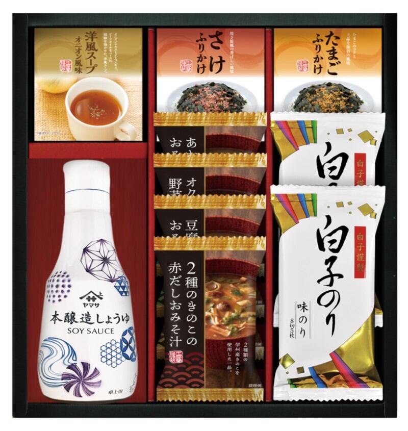 商品内容:ヤマサ鮮度しょうゆ200ml、とうふと油揚げのおみそ汁、2種のきのこの赤だしおみそ汁、あおさとわかめのおみそ汁、オクラ入ねばねば野菜スープ、丸美屋たまごふりかけ(2.5g×3)、丸美屋さけふりかけ(2.5g×3)、丸美屋洋風スープオニオン風味(2.5g×3)、白子のり味のり(8切5枚)×2