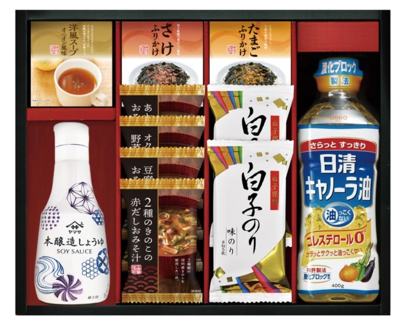 商品内容:ヤマサ鮮度しょうゆ200ml、とうふと油揚げのおみそ汁、2種のきのこの赤だしおみそ汁、あおさとわかめのおみそ汁、オクラ入ねばねば野菜スープ、丸美屋たまごふりかけ(2.5g×3)、丸美屋さけふりかけ(2.5g×3)、丸美屋洋風スープオニオン風味(2.5g×3)、白子のり味のり(8切5枚)×2、日清キャノーラ油400g