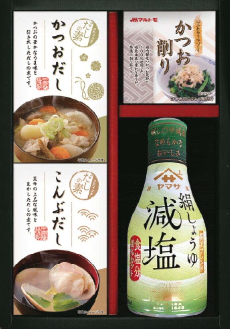 商品内容:ヤマサ絹しょうゆ減塩200ml、かね七かつおだし(4g×5)、かね七こんぶだし(4g×5)、マルトモかつおパック(0.7g×3)