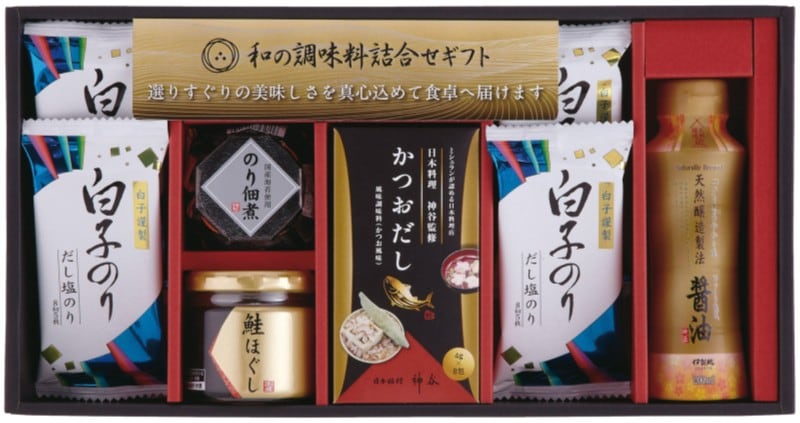 商品内容:のり佃煮80g×1・鮭ほぐし50g×1・かつおだし(4g×8袋)×1・伊賀越 天然醸造醤油 200ml×1・白子だし塩のり(8切5枚 )×4