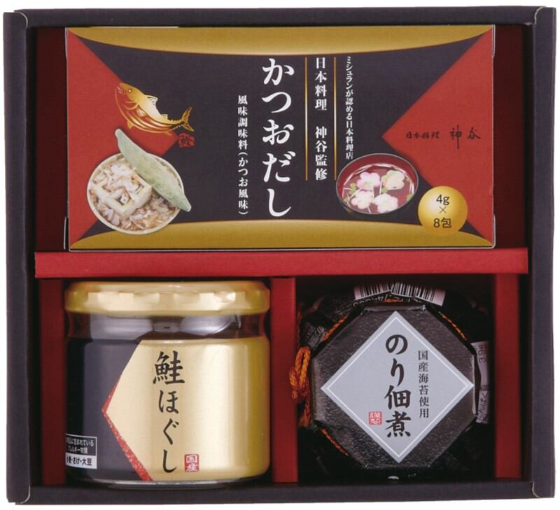 商品内容:鮭ほぐし50g×1 ・のり佃煮80g×1 ・かつおだし(4g×8袋)×1