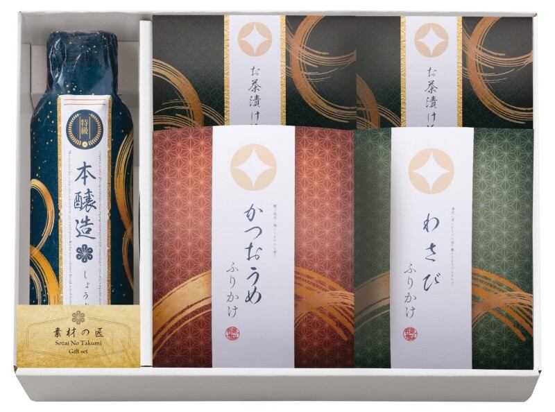 商品内容:特級本醸造しょうゆ300ml×1、鰹梅ふりかけ2.5g×2、わさびふりかけ 2.5g×2、お茶漬け海苔×4