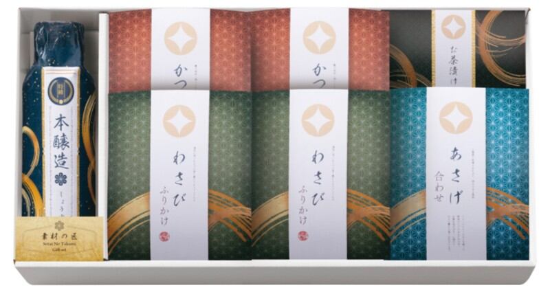 商品内容:特級本醸造しょうゆ300ml×1、あさげ2P×1、鰹梅ふりかけ2.5g×4、わさびふりかけ 2.5g×4、お茶漬け海苔×2