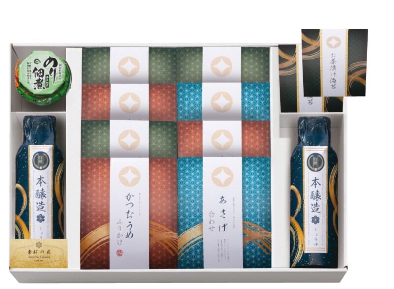 商品内容:特級本醸造しょうゆ300ml×2、あさげ2P×2、鰹梅ふりかけ2.5g×6、わさびふりかけ 2.5g×6、お茶漬け海苔×4、島乃香のり佃煮×1